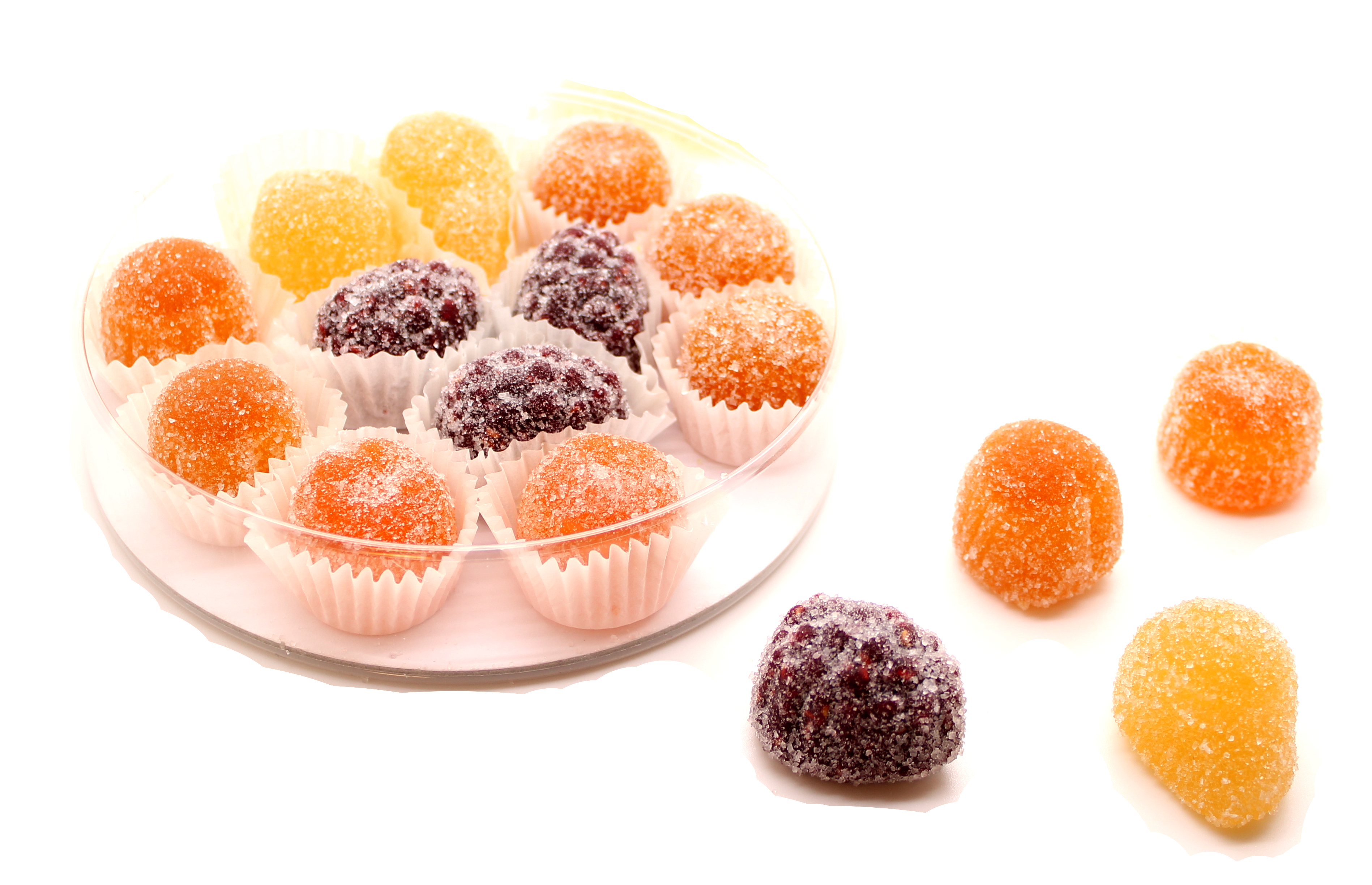 Enrobage : sucre. Assortiment de pâte de framboise, de mirabelle, de poire, de pomme.