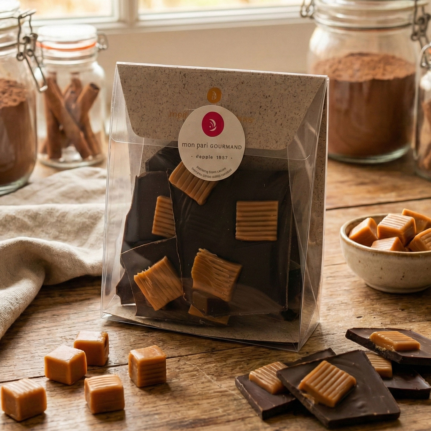 Eclats de chocolat Noir ou au Lait, Caramel au beurre, salé, 200 g.