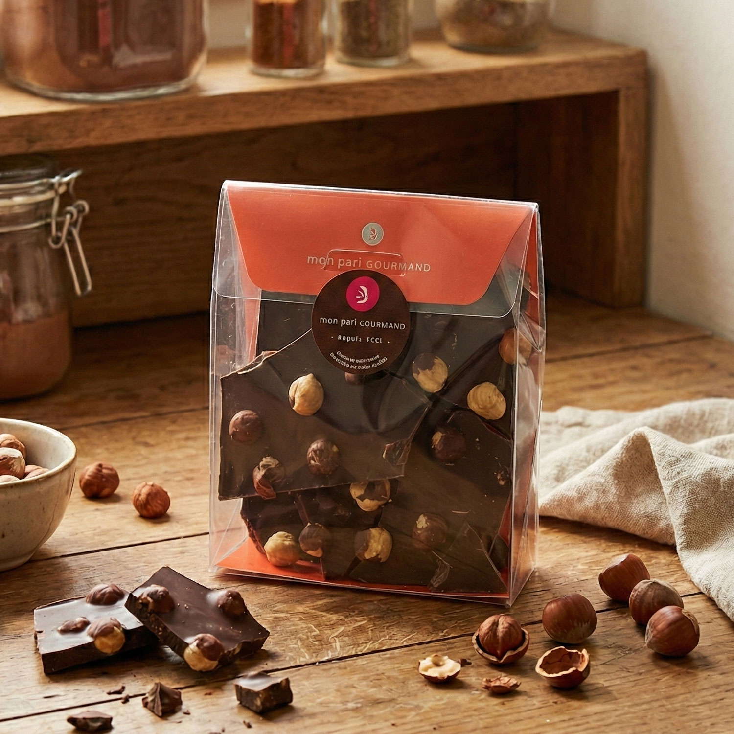 De délicats éclats de chocolat noir intense 70 % de cacao ou de chocolat au lait onctueux, généreusement parsemés de noisettes entières. Élaboré à partir de fèves de cacao soigneusement sélectionnées parmi les meilleurs crus du monde, cet assemblage exclusif révèle toute la richesse et l’élégance d’un chocolat d’exception.