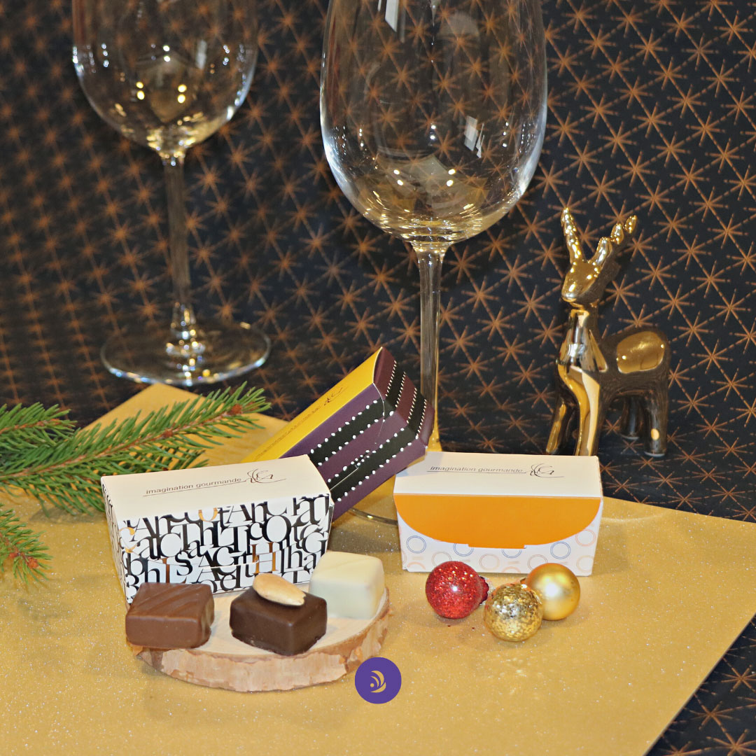 Pour toutes les occasions, recevez vos invités avec, en cadeau à offrir, ces minis ballotins contenant 3 bonbons de chocolats emblématiques : ganache, praliné, caramel. Vendus par 5.