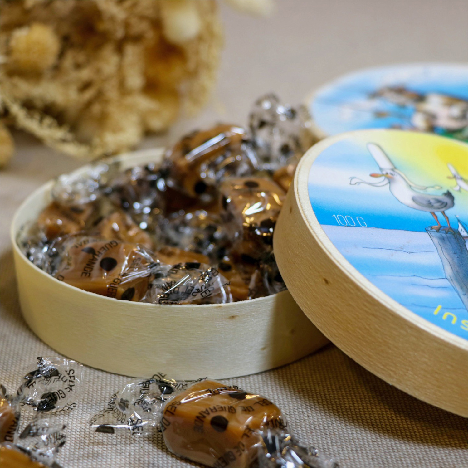 Un caramel au beurre A.O.P. Charentes-Poitou cuisiné à basse température, marié au célèbre sel de Guérande. Dans une jolie boite en bois, partez à la découverte du subtil secret de ces mouettes bretonnes !