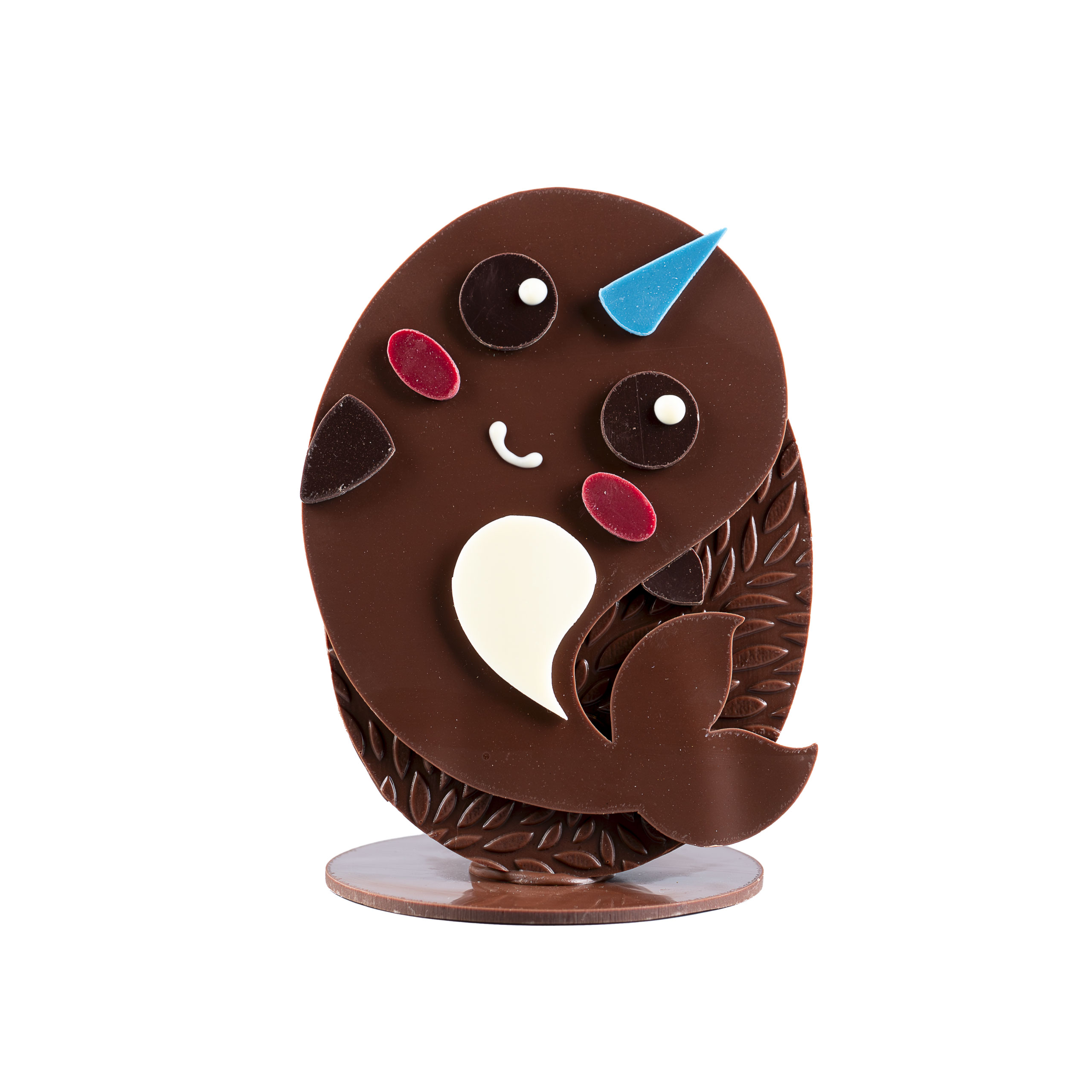 Moulage en chocolat au lait, garni de friture et d’œufs praliné, À la pièce.