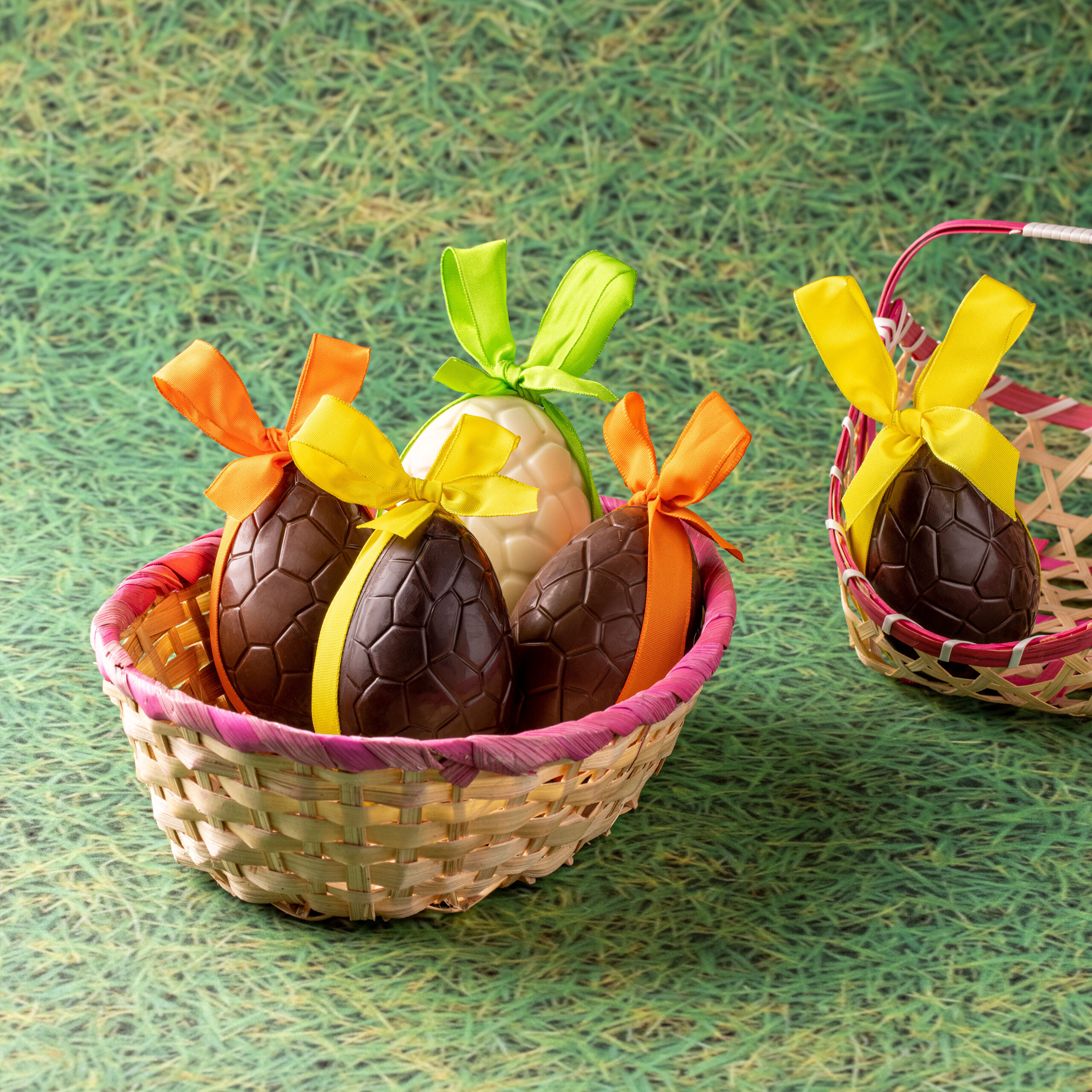 L’œuf de Pâques traditionnel, symbole du renouveau et de l’éclosion de la nature depuis l’antiquité. En chocolat au Lait, il est garni d’un assortiment de fritures et d’œufs au praliné et sont habillées d’un joli ruban coloré.