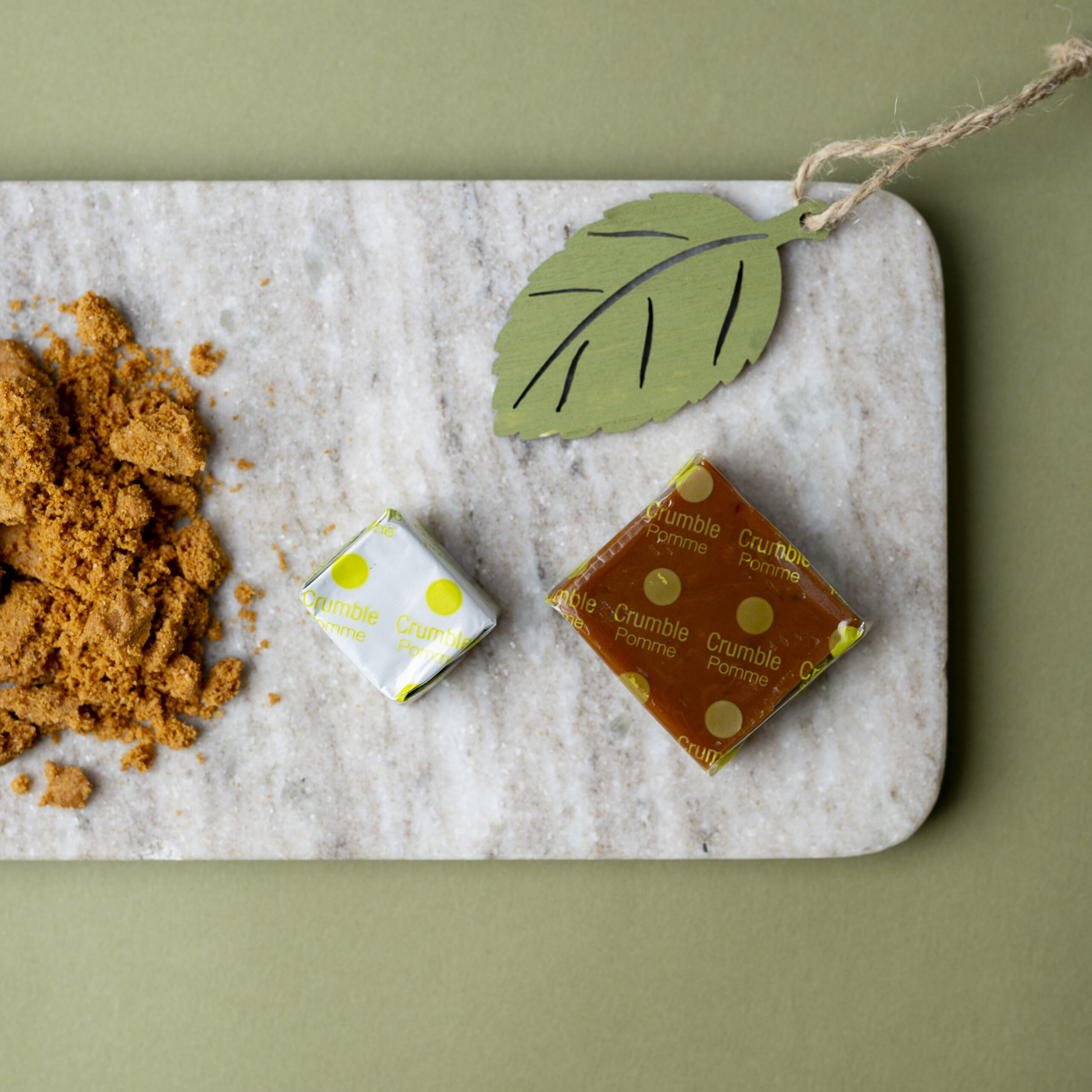 Un tendre caramel avec des inclusions de biscuits façon crumble et de petits morceaux de pommes confites. Les caramels sont cuisinés dans nos ateliers, en cuisson lente à basse température. Cette technique assure tendresse, moelleux et saveurs exceptionnelles aux gourmandises.